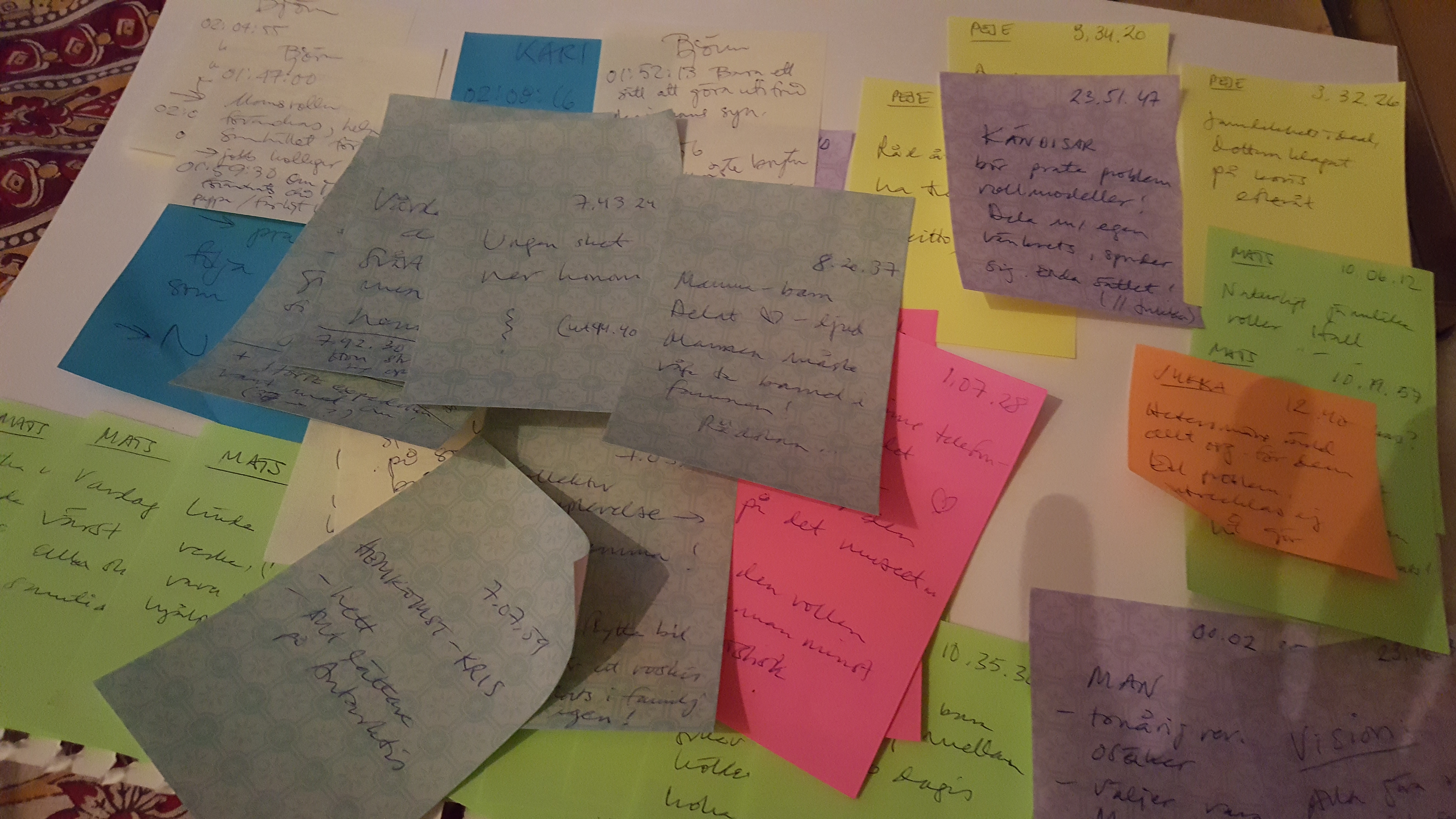 During the darkest time of year we sit and go through all the hours upon hours of footage for our series about the male role. Post-its of many colors representing snippets of interview change places and slowly but surely a structure starts to form. We have thoroughly interviewed 8 men from the ages of 26-82 and at times it feels like mission impossible to try and boil down 16 hours of good interview material to three 30min. programs. “It’s like having to chop off an arm and a leg to have to waste so much good material”, Emma says, “maybe we should call the Finnish Broadcasting company and suggest one more part for the series”? Here Emma in full action late one night.